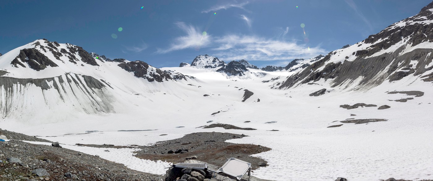 Am 25.5.2018 sammelten wir die ersten Schneeproben am Jamtalferner und installierten ein Zeitraffersystem, um die Veränderungen der Gletscheroberfläche zu dokumentieren. Das System nimmt im 30min Intervall Fotos auf und zeichnet zusätzlich Daten zur Temperatur und Luftfeuchte auf. Die Anreise ins Jamtal war sehr abwechslungsreich. Aufgrund der Schneelage konnten wir nur den ersten Teil der Zufahrtsstraße mit dem Auto zurücklegen. Die restliche Strecke bewältigten wir mit Mountainbikes und schlussendlich marschierten wir mit Schneeschuhen zu unserem Ziel. Ein paar Impressionen unserer kleinen Expedition sind im folgenden Video zu sehen.