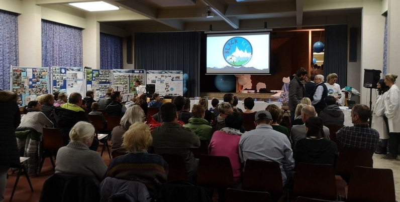 Die SchülerInnen der NMS Reutte unter der Leitung von Frau Gerda Bubendorfer haben uns als Projektteam tatsächlich den Atem geraubt mit ihrer Interpretation des Projektes. Wissenschaft bedeutet nicht nur Zahlen, Graphen, und trockene Fakten, sondern Leidenschaft, Poesie, Musik und auch Humor. Eine Darbietung der Jungforscher ohne viel Einmischung von uns so genannten Silberrücken vor einer gefüllten Aula, die sich vor nichts verstecken musste. BLACK.ICE wurde wohl niemals lebendiger dargestellt als von diesen Jugendlichen, welche mit einem nicht zu übertreffenden Eifer und Ernst für diesen Abend geprobt und getüftelt haben. Begrüßt wurde das neugierige Publikum mit einem selbst komponierten Eispickelwalzer, passend zum Thema. Ohne viel einleitender Worte führten die SchülerInnen das Publikum in der Rolle als Pinguin und schwitzender Eisbär in die Thematik des Klimawandels ein und diese dringende Botschaft und Aufruf zum Handeln hat wohl jeder verstanden. Der Direktor der Schule, Herr Wagner, musste die jungen Wissenschaftler im Labormantel doch nochmals genau zu dieser Thematik befragen im Rahmen einer Talkshow. Seine Fragen wurden hochprofessionell beantwortet, bis es ihnen doch zu bunt wurde und die letzte Frage zerschmettert wurde mit der Ansage, dass sie nun dringend weiterforschen müssten, da sie für solche sinnlosen Talkshows keine Zeit hätten. Dazu wurde auch das erste Projektgedicht vorgetragen – ein Abriss der bisherigen gemeinsamen Projektlaufzeit in Versen. Herzerfrischend!